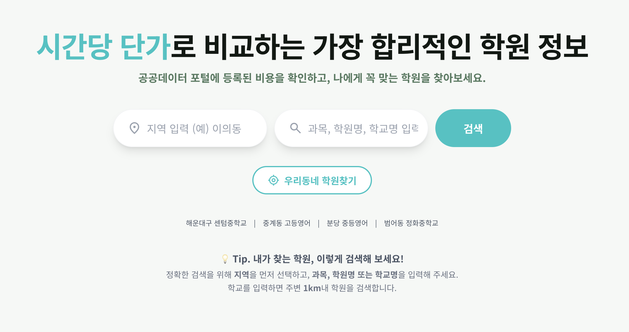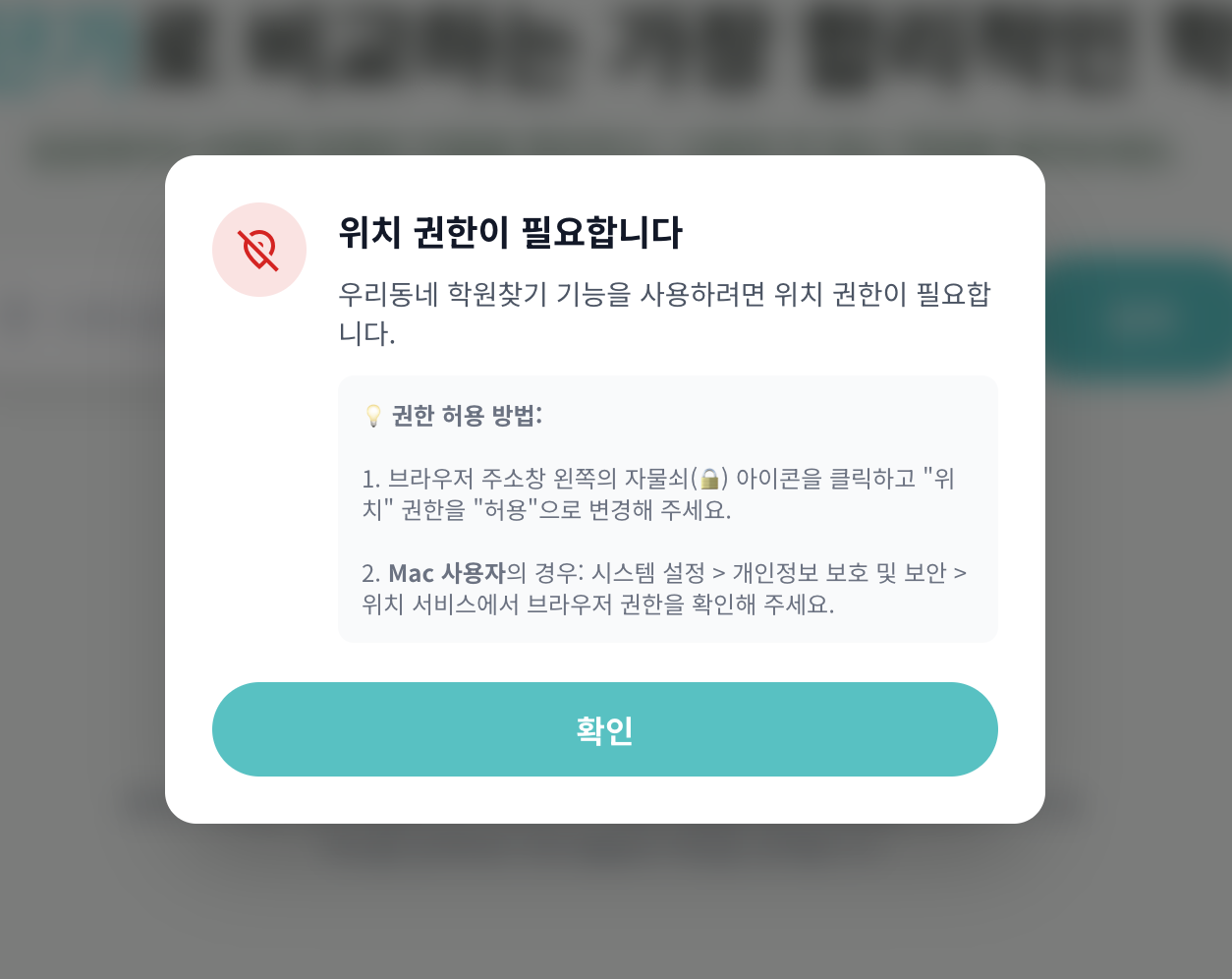 우리동네 학원찾기는 현재 위치를 기준으로 1.5km 이내의 학원 리스트를 보여줍니다