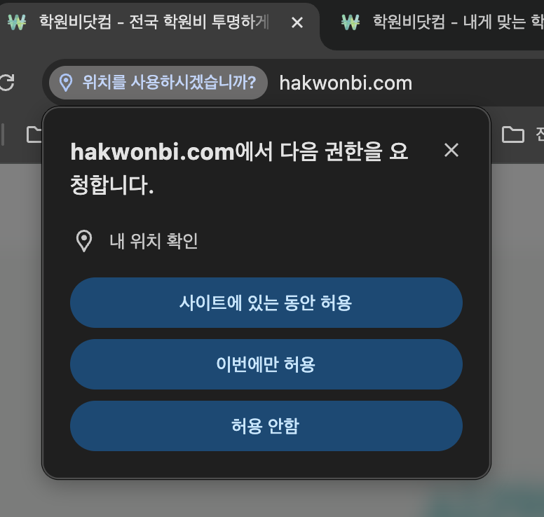위치 권한이 부여되어 있지 않으면 권한을 받아야 합니다.