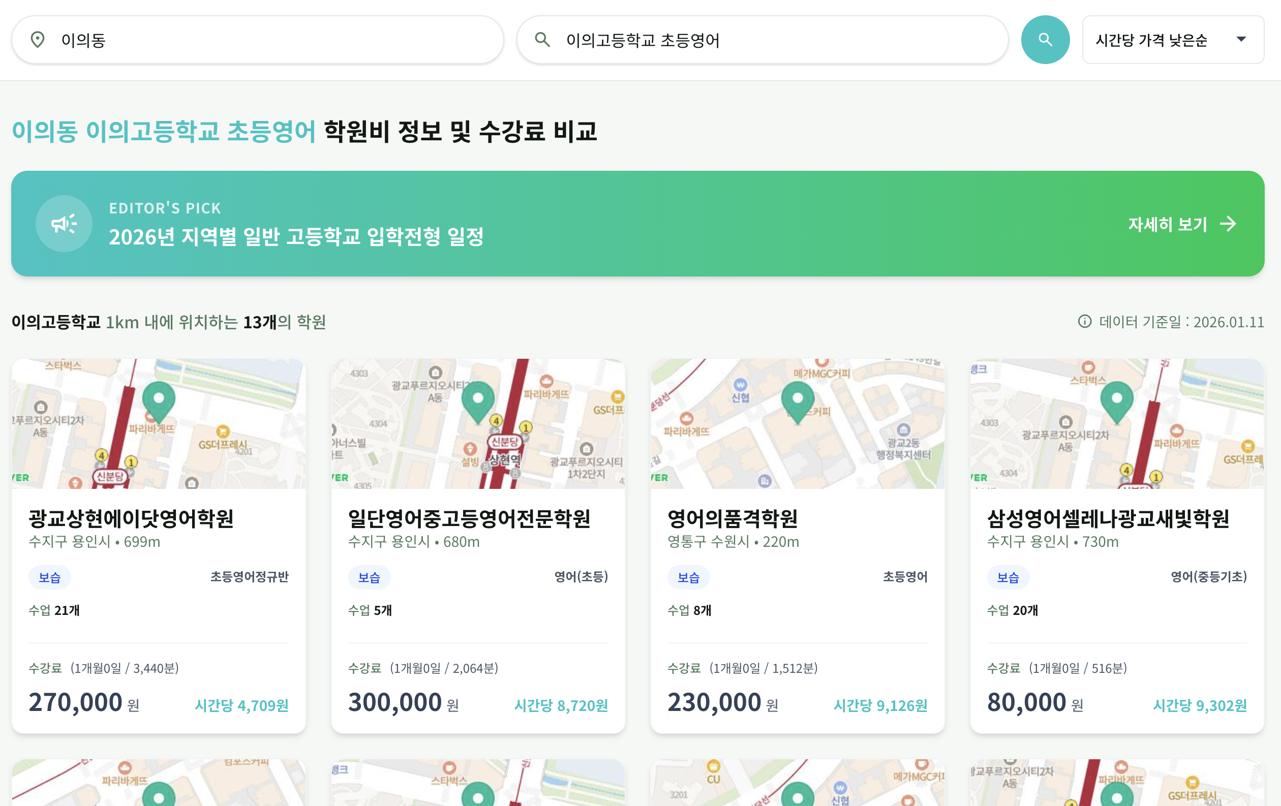 학교근처 1km이내의 해당 과목을 가진 학원들이 노출되도록 업데이트 되었습니다.
